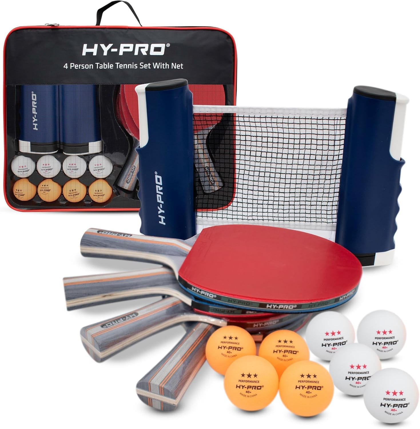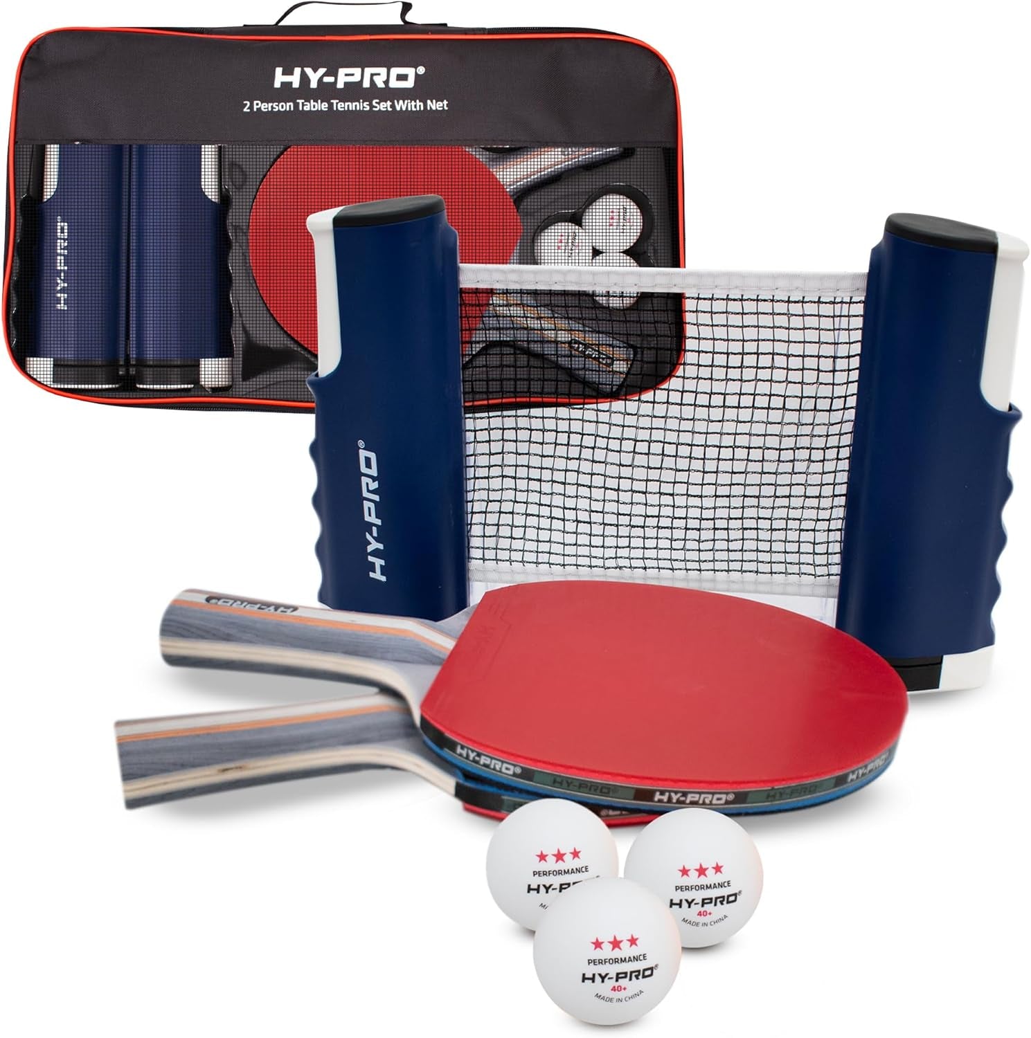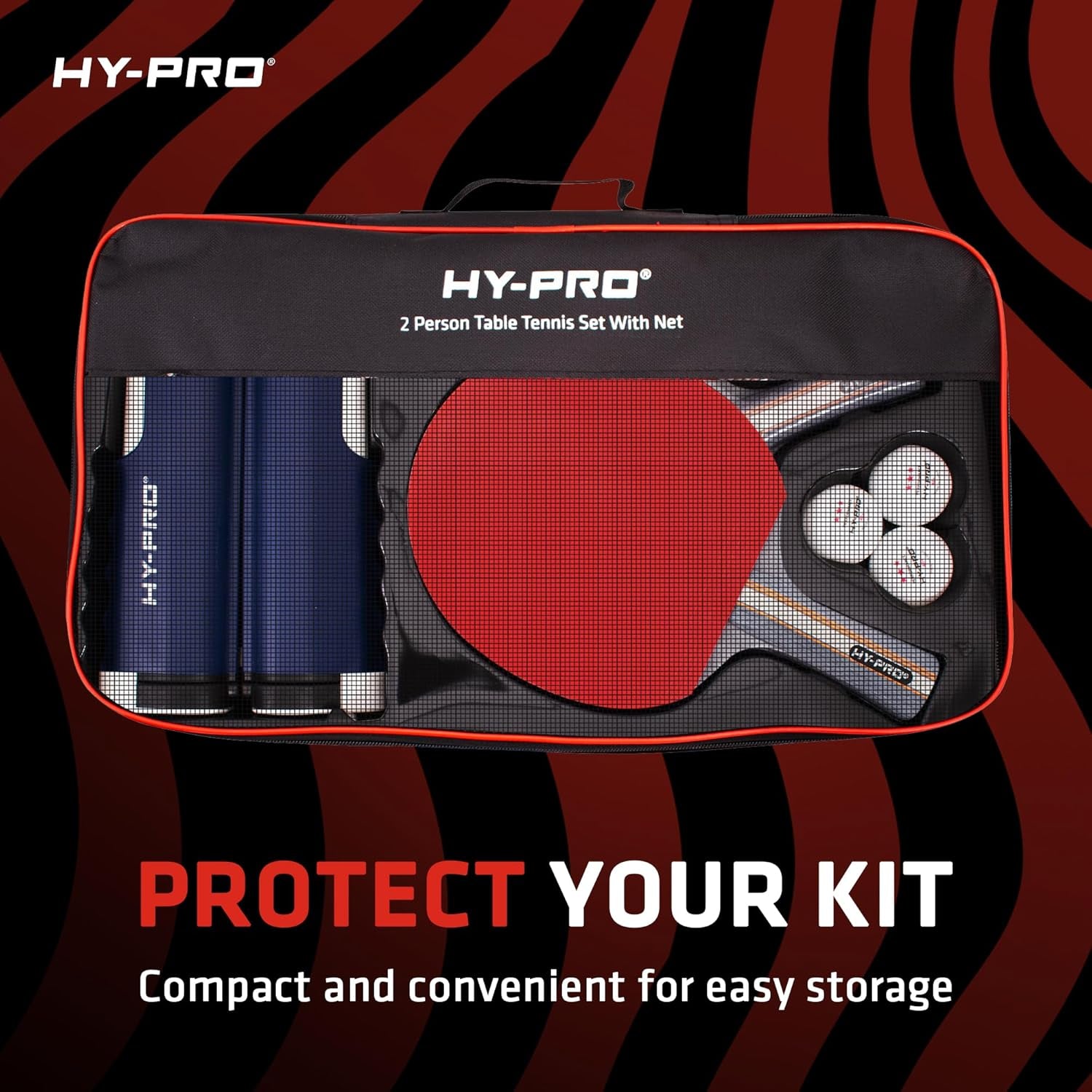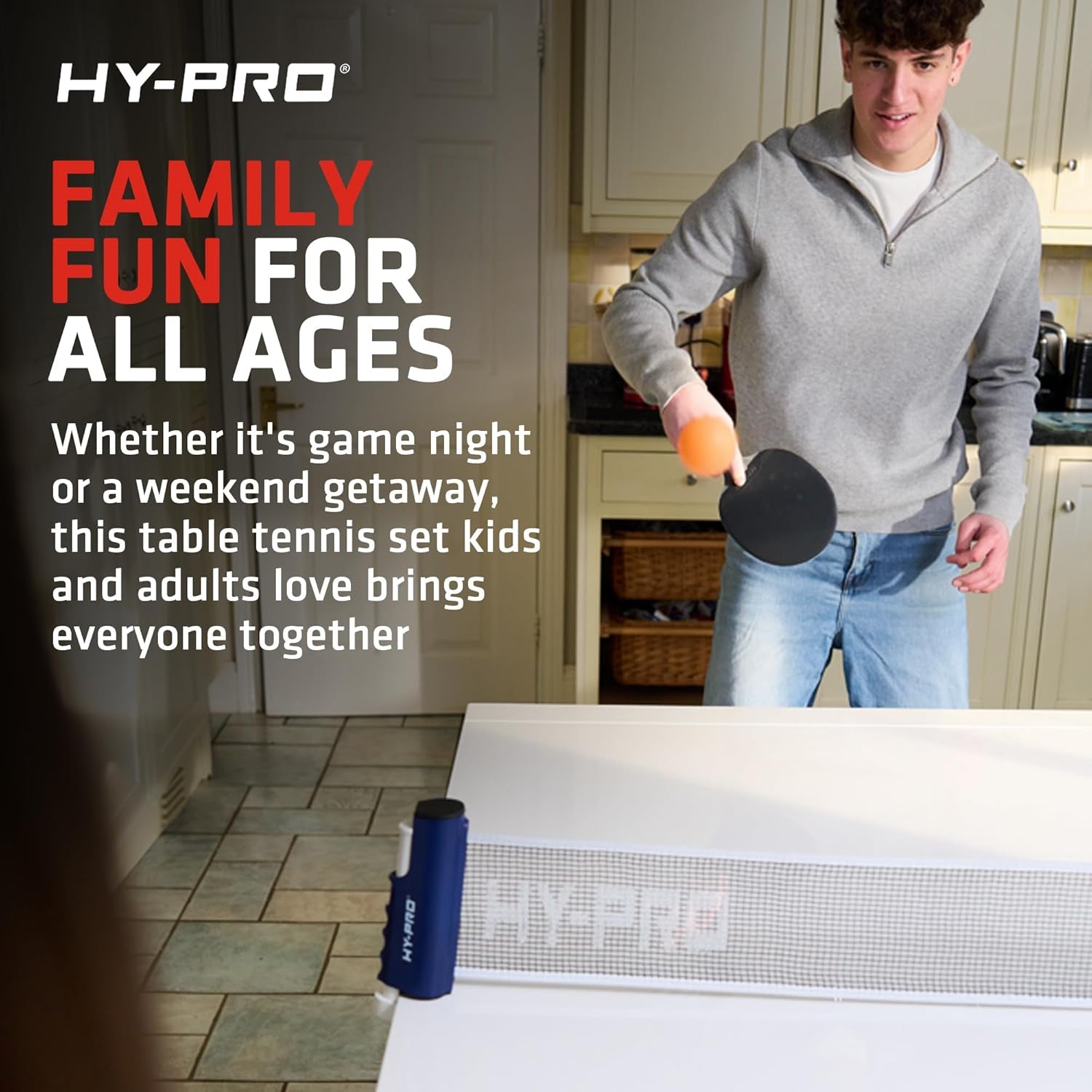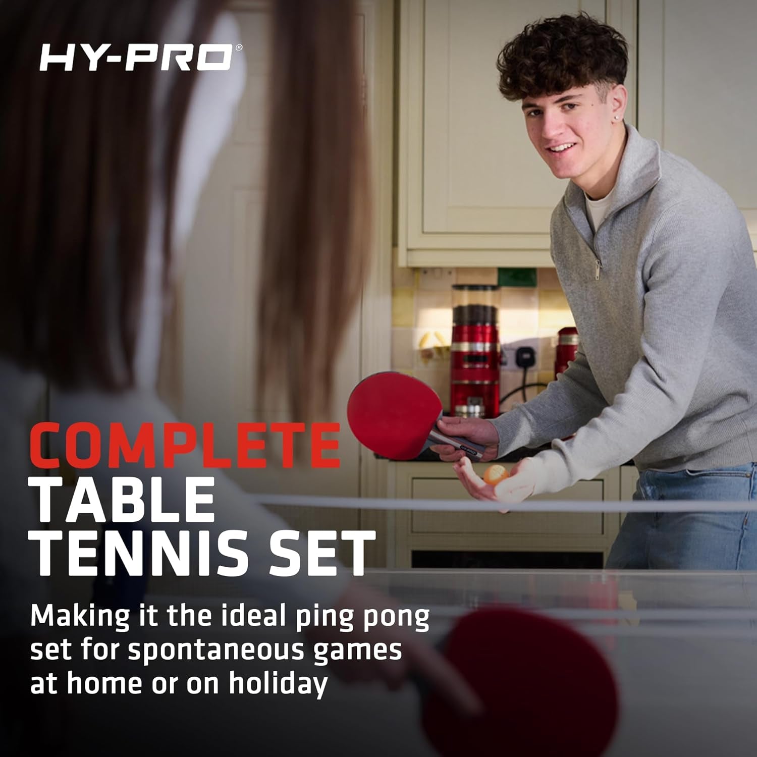 Turn any table into a ping-pong arena with the Hy-Pro Table Tennis Set, the ultimate portable kit for players of all ages and skill levels. Designed for 2 or 4 people, this complete set includes premium table tennis bats, balls, a retractable net, and a compact carry case, making it perfect for home, office, travel, or outdoor fun.