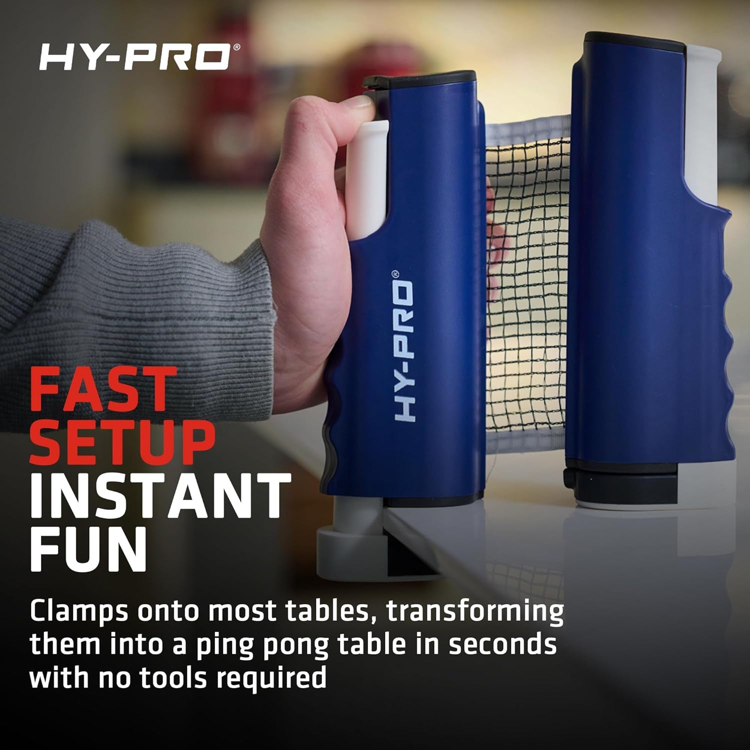 The retractable net securely clips onto most tabletops, transforming them into a ready-to-play ping pong surface in moments.