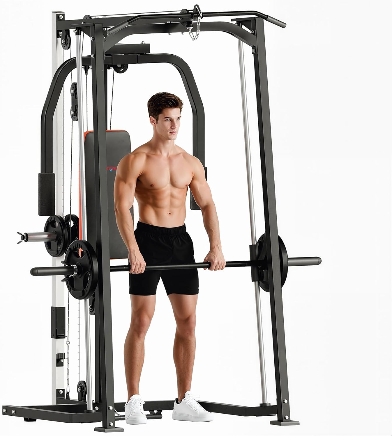 3-In-1 Multifunctional Design – Smith machine, cable pulleys, and chest press station in one