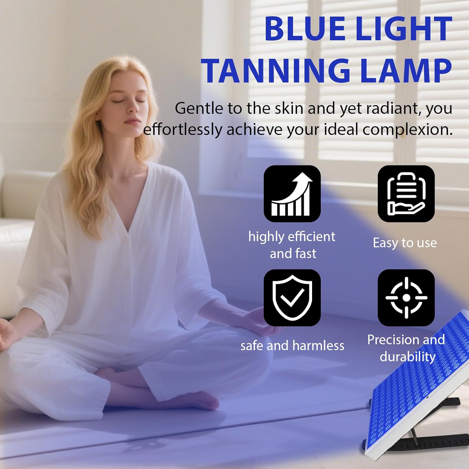This tanning lamp is designed for full-body and facial use, providing LED daylight for effective self-tanning and sun therapy. Equipped with a tripod and protective eye mask, it offers a safe and convenient way to enjoy the benefits of sunlight indoors.