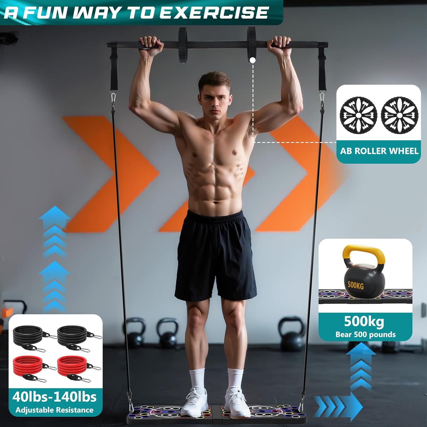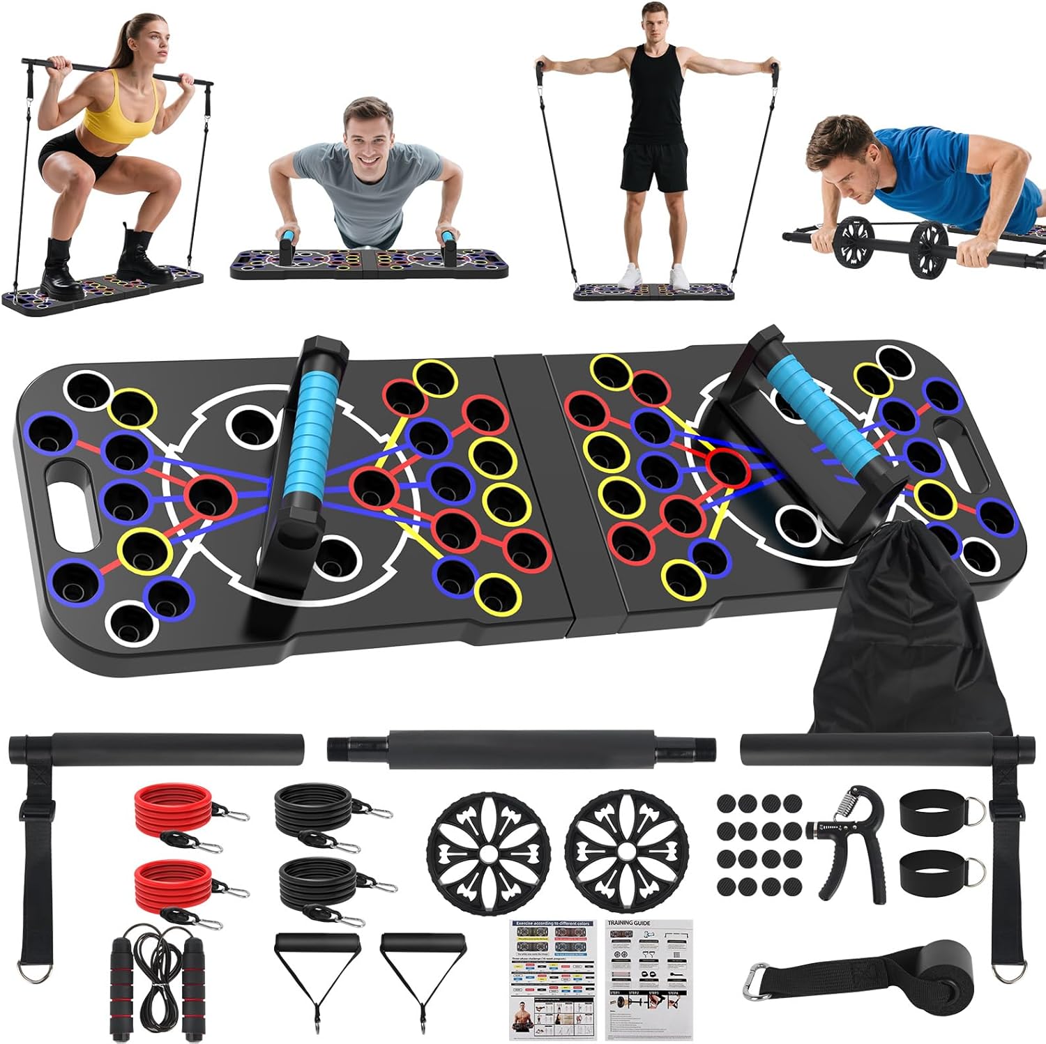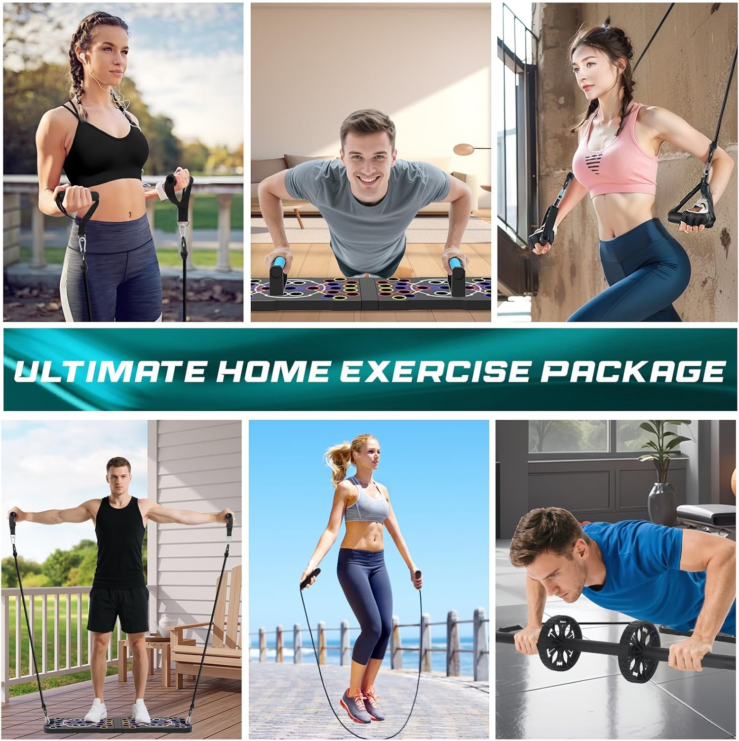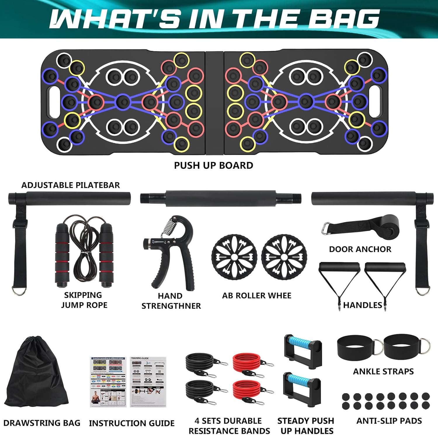 The set includes everything you need for upper body, core, and functional training: a stable push-up board, smooth-gliding ab roller wheel, Pilates bar, adjustable pulleys, resistance bands, and versatile wrist/ankle straps. With rubber-grip handles, you’ll enjoy secure, comfortable control during every movement.