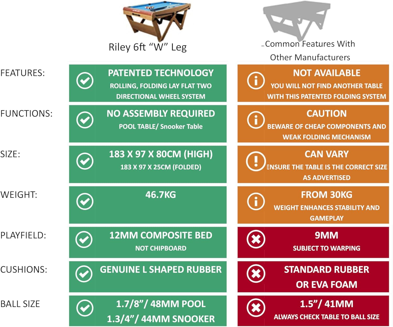 W” Leg 6Ft Snooker & Pool Table – No Assembly Required