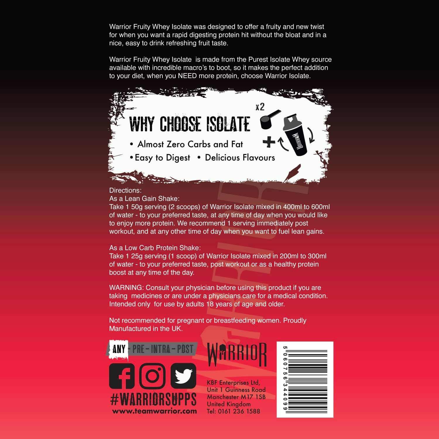 Refresh and refuel after workouts with Warrior Fruity Clear Whey Isolate, a rapid-digesting protein powder designed for fast absorption and...